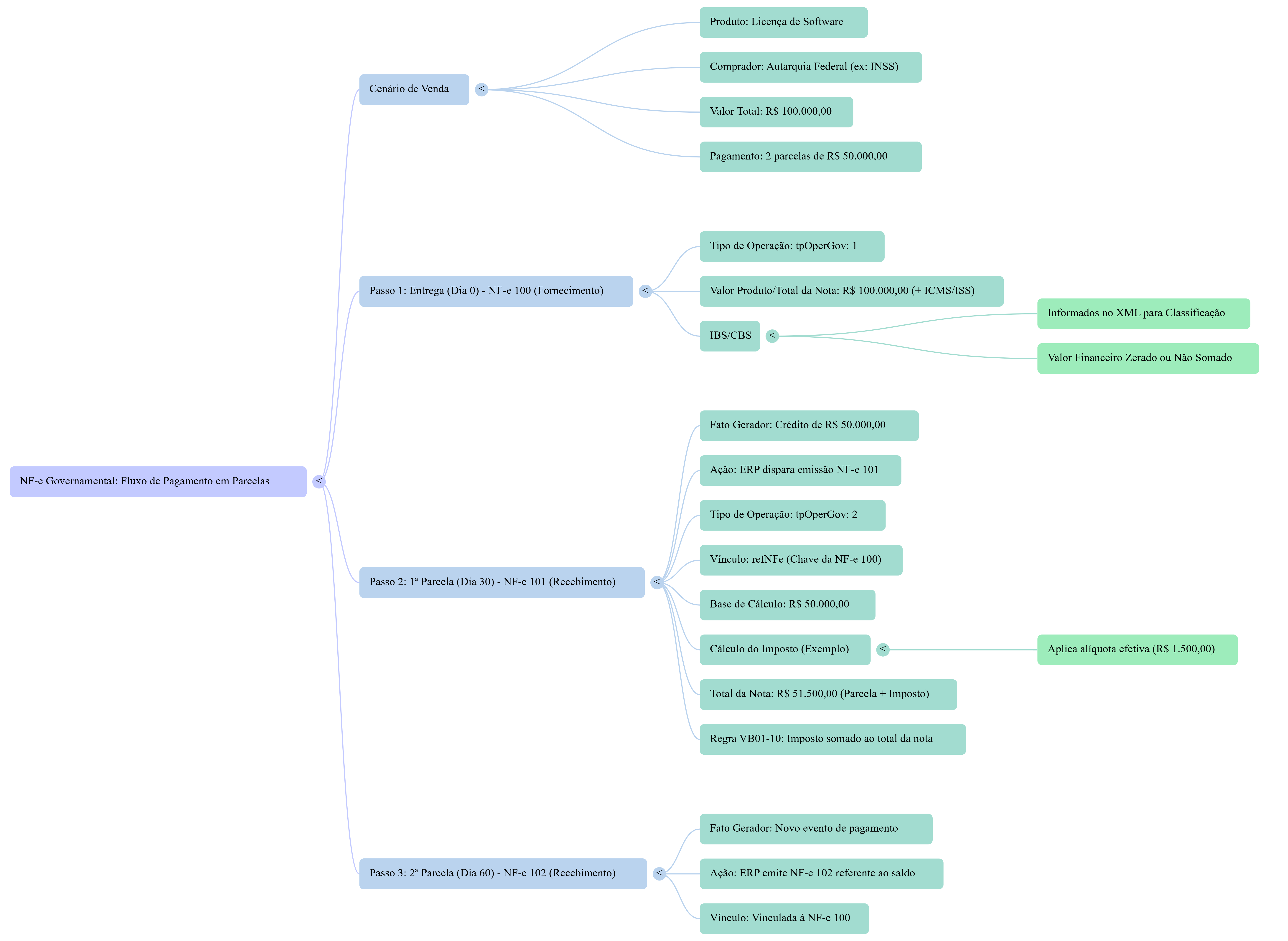 A partir do regime definitivo (2027), especialmente nas notas de recebimento de pagamento marcadas com tpOperGov = 2, deve-se calcular o total da nota somando o valor recebido com os tributos. Como o IBS e a CBS são tributos “por fora”, a totalização é obrigatoriamente maior que o valor financeiro pago pelo ente público. Assim, a fórmula a ser observada é: Total da Nota = Valor da Parcela Recebida + Valor do IBS + Valor da CBS.