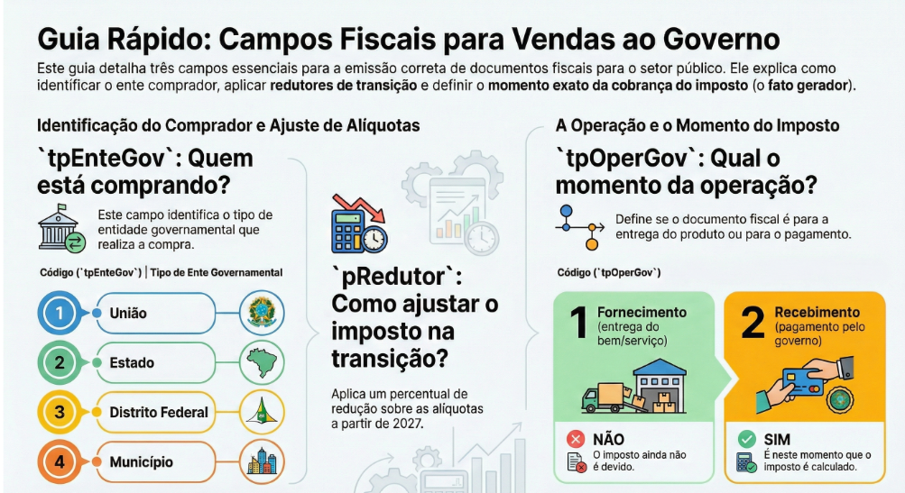 Assim, se a venda envolver redução de alíquota por tipo de órgão comprador (federal, estadual ou municipal), o cClassTrib escolhido deve permitir o uso do grupo gRed. Da mesma forma, se for uma venda direta a um órgão público, o grupo gCompraGov deve ser informado com o tipo de ente governamental (tpEnteGov), o tipo de operação (tpOperGov) e, quando aplicável, o percentual redutor (pRedutor).