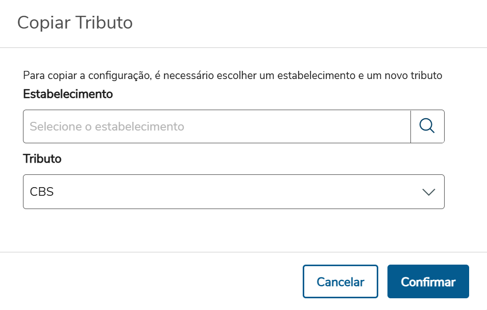 Ao acionar esta opção, é exibida uma tela auxiliar onde é possível selecionar o estabelecimento e o imposto que serão utilizados na nova configuração gerada a partir da cópia.