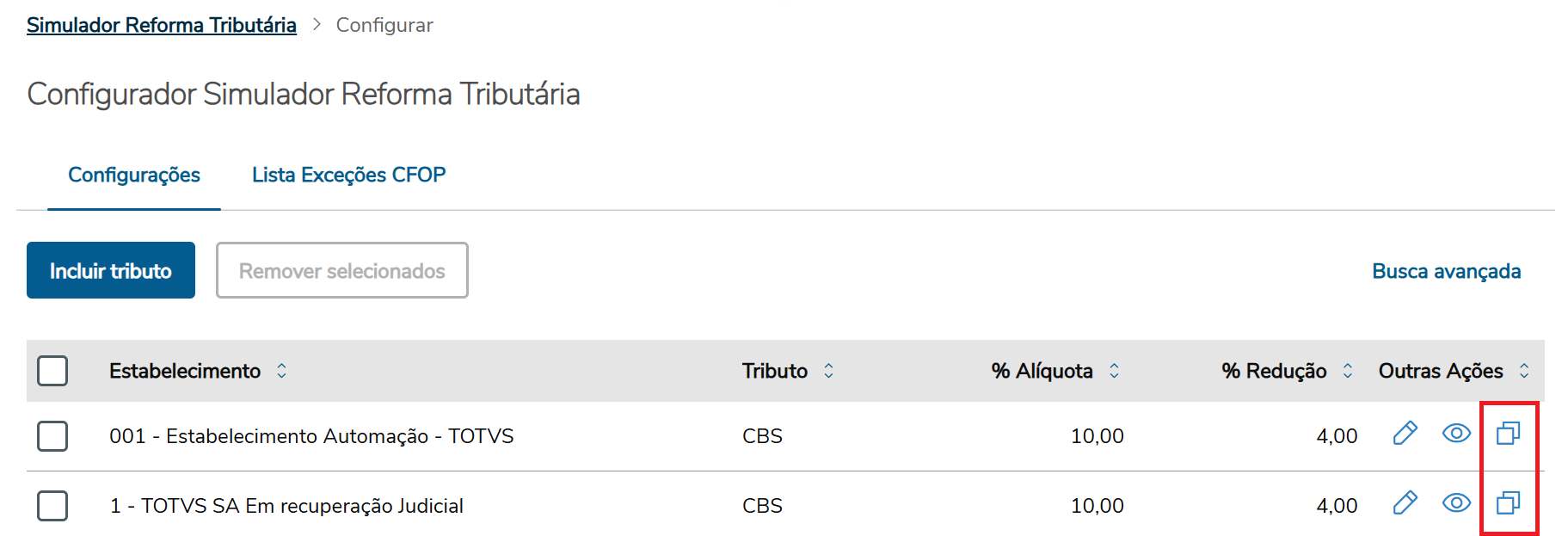 Agora, o usuário pode realizar a cópia de uma configuração de forma prática, clicando no ícone de cópia (destacado em vermelho na figura abaixo).