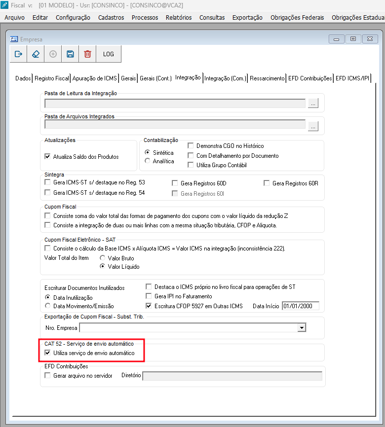Imagem 1 - Grupo CAT52 – Serviço de Envio Automático - Tela Parâmetro Empresa - Aba Integração