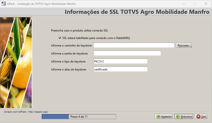 Nesta etapa, podemos configurar no produto TOTVS Agro Mobilidade Manfro, a utilização de certificado SSL, sendo opcional está utilização.