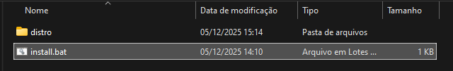 Após realizar o download e extrair o instalador, execute o arquivo install.bat com privilégios de administrador para iniciar o processo de instalação.