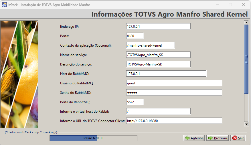 Na próxima etapa, serão configurados os serviços necessários para a aplicação TOTVS Agro Manfro Shared Kernel, se foi selecionado para instalação.