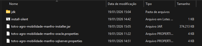 Os parâmetros de instalação são definidos por meio do preenchimento de um arquivo de propriedades, que deve ser totvs-agro-mobilidade-manfro-oracle.properties ou totvs-agro-mobilidade-manfro-sqlserver.properties, conforme o sistema operacional utilizado.