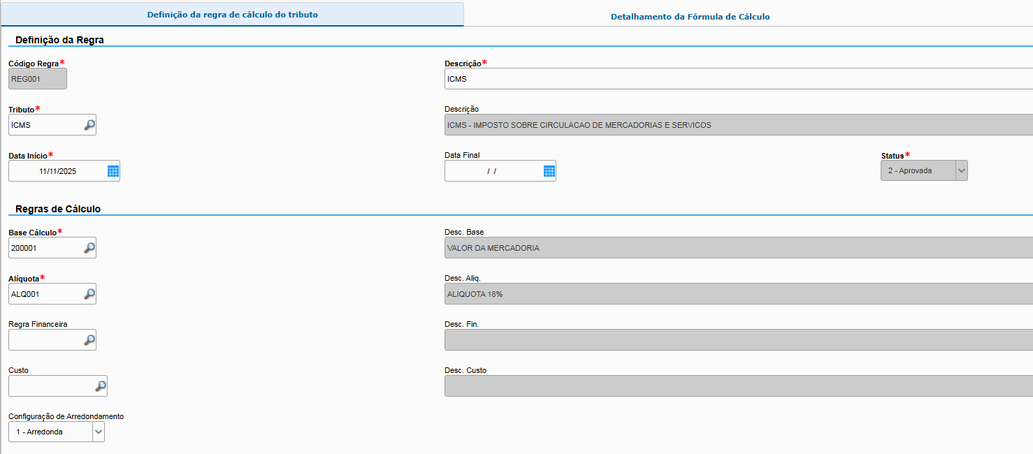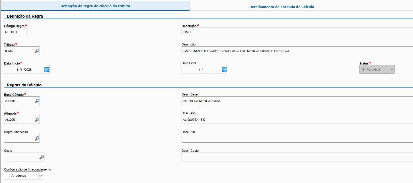 Para a demonstração utilizarei uma regra tributária previamente cadastrada.
