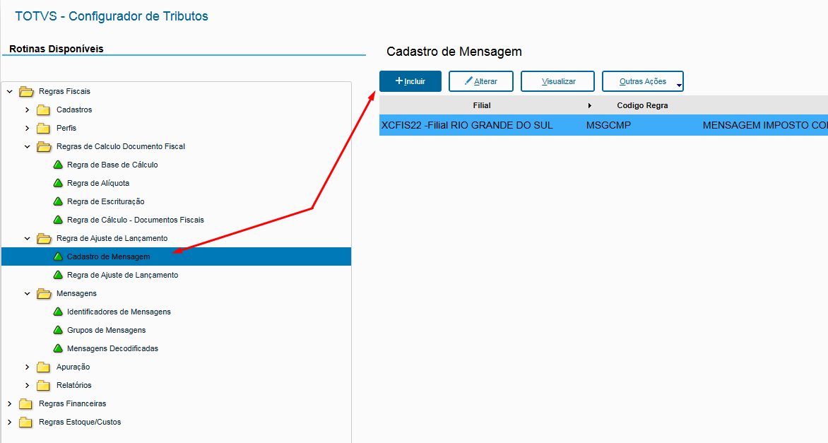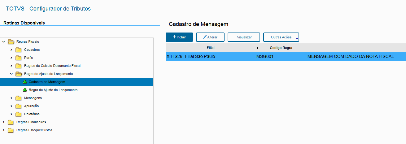 Configurador de Tributos > Regras Fiscais > Regra de Ajuste de Lançamento > Cadastro de Mensagens