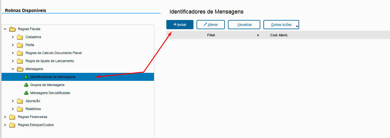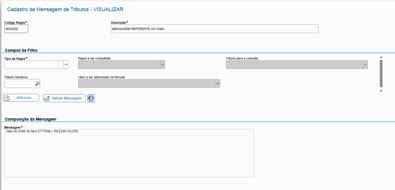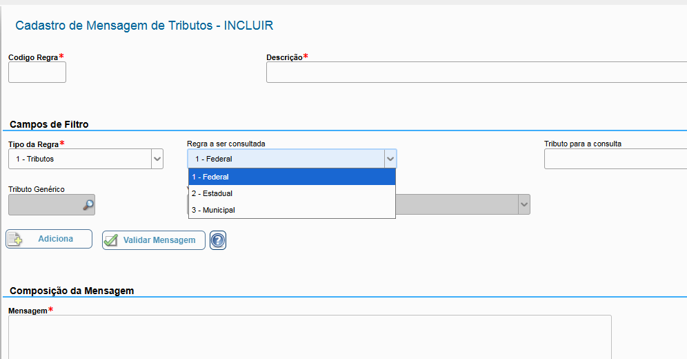 Configurador de Tributos > Regras Fiscais > Mensagens > Identificadores de Mensagens