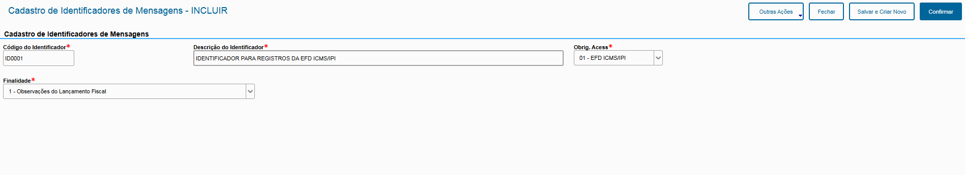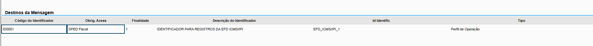 A rotina de identificadores de Mensagens tem por objetivo, como o próprio nome diz, identificar o uso da mensagem. Como dissemos no começo desse documento, a Mensageria é uma rotina auxiliar. Desta forma, os identificadores servem para indicar onde cada mensagem deve ser levada, se para as TAGS das notas fiscais eletrônicas ou registros EFD ICMS/IPI.
