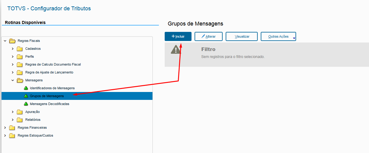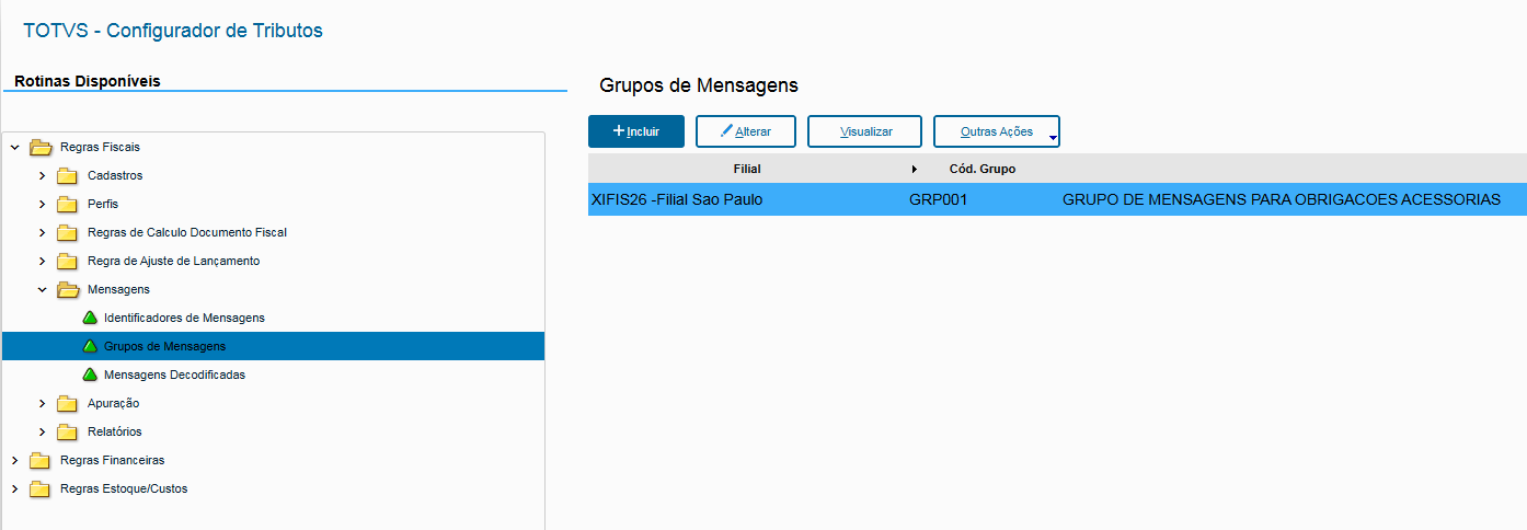 Configurador de Tributos > Regras Fiscais > Mensagens > Grupos de Mensagens