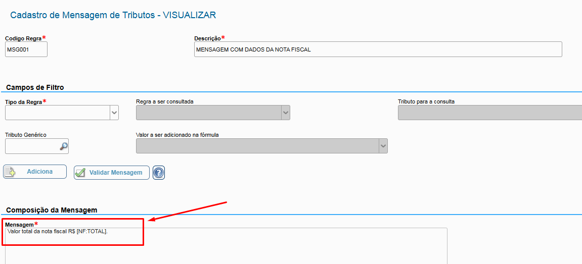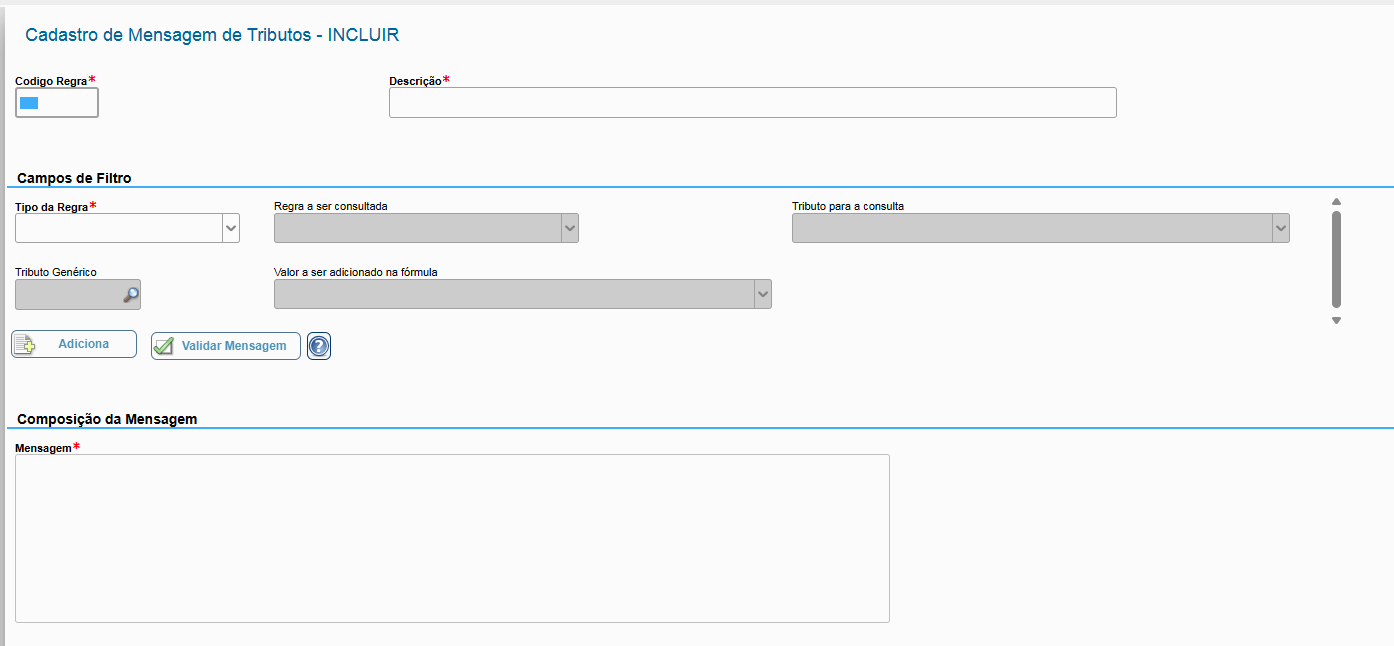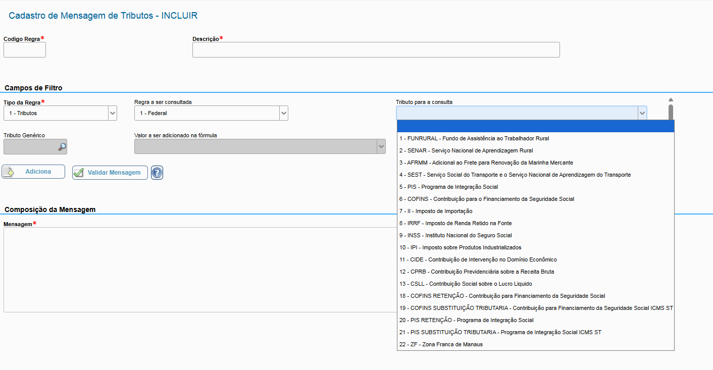 Agora que temos o tributo, faremos o cadastro de uma mensagem: