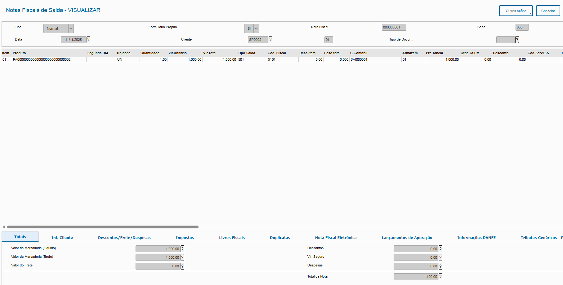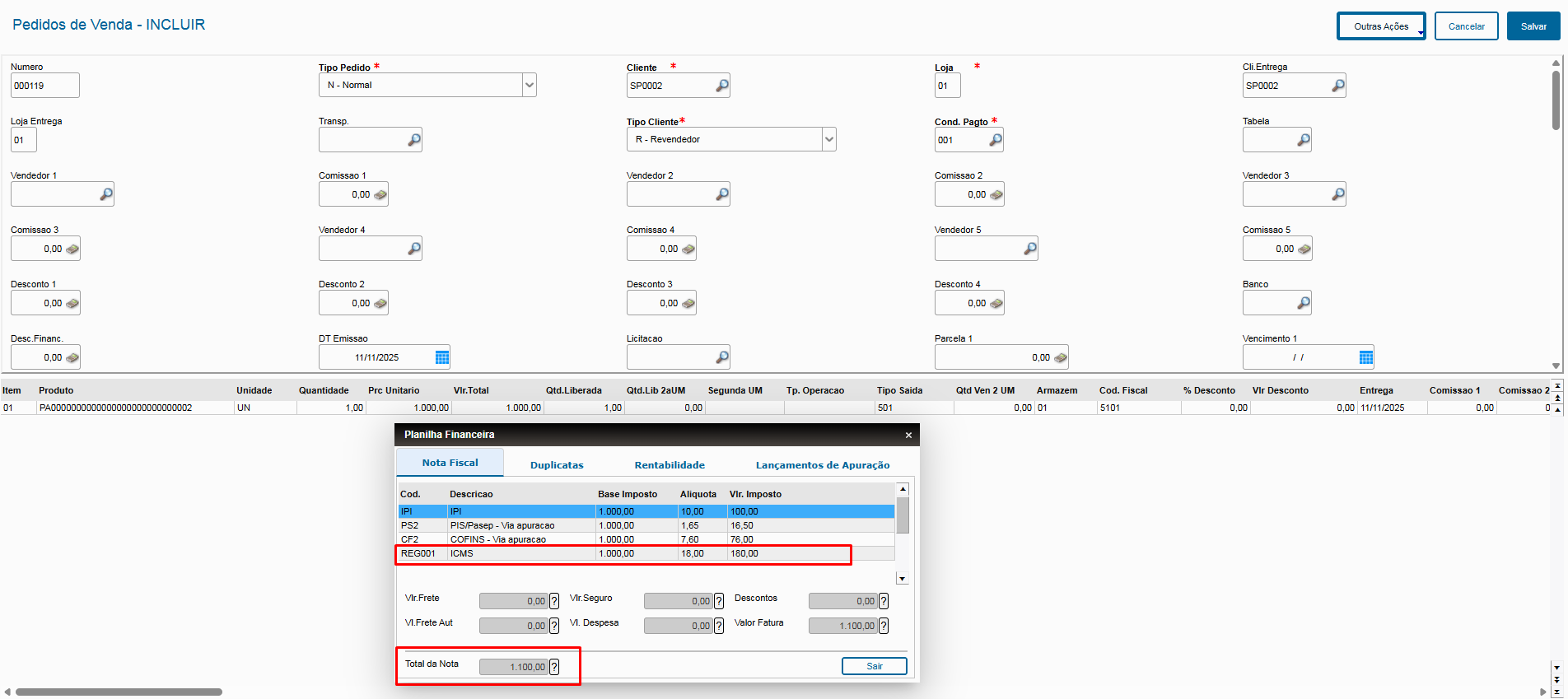 Acima temos o exemplo de pedido de venda com o ICMS calculado pelo Configurador de Tributos. Além disso podemos ver que o valor total da NF é de R$ 1.100,00. Esse será o valor estampado na mensagem após faturarmos esse pedido.