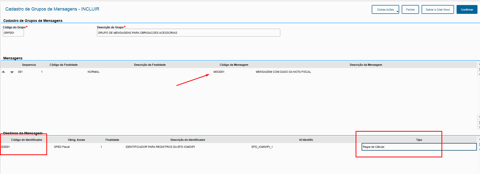 Para vincular um grupo de mensagens foram criados no perfil de operação, na regra de escrituração e na regra de cálculo campos para isso.