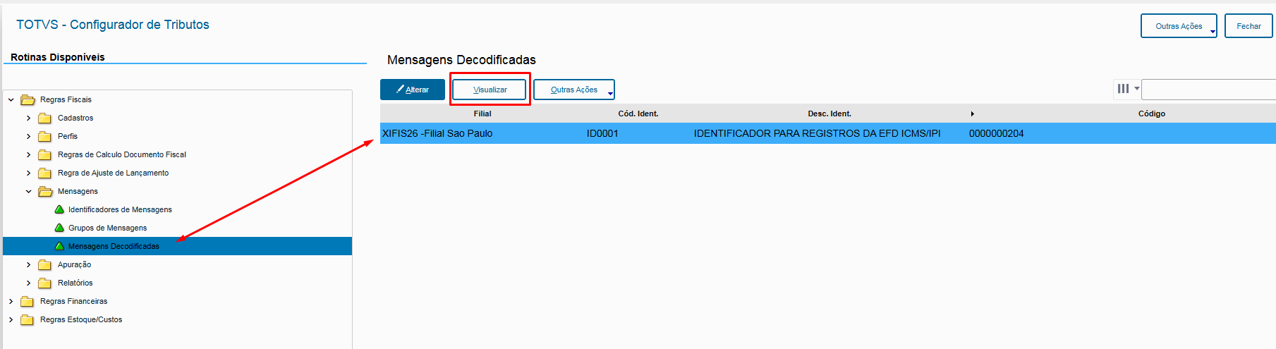 Com isso podemos verificar se houve a decodificação da mensagem voltando ao Configurador de Tributos e acessando Mensagens > Mensagens Decodificadas: