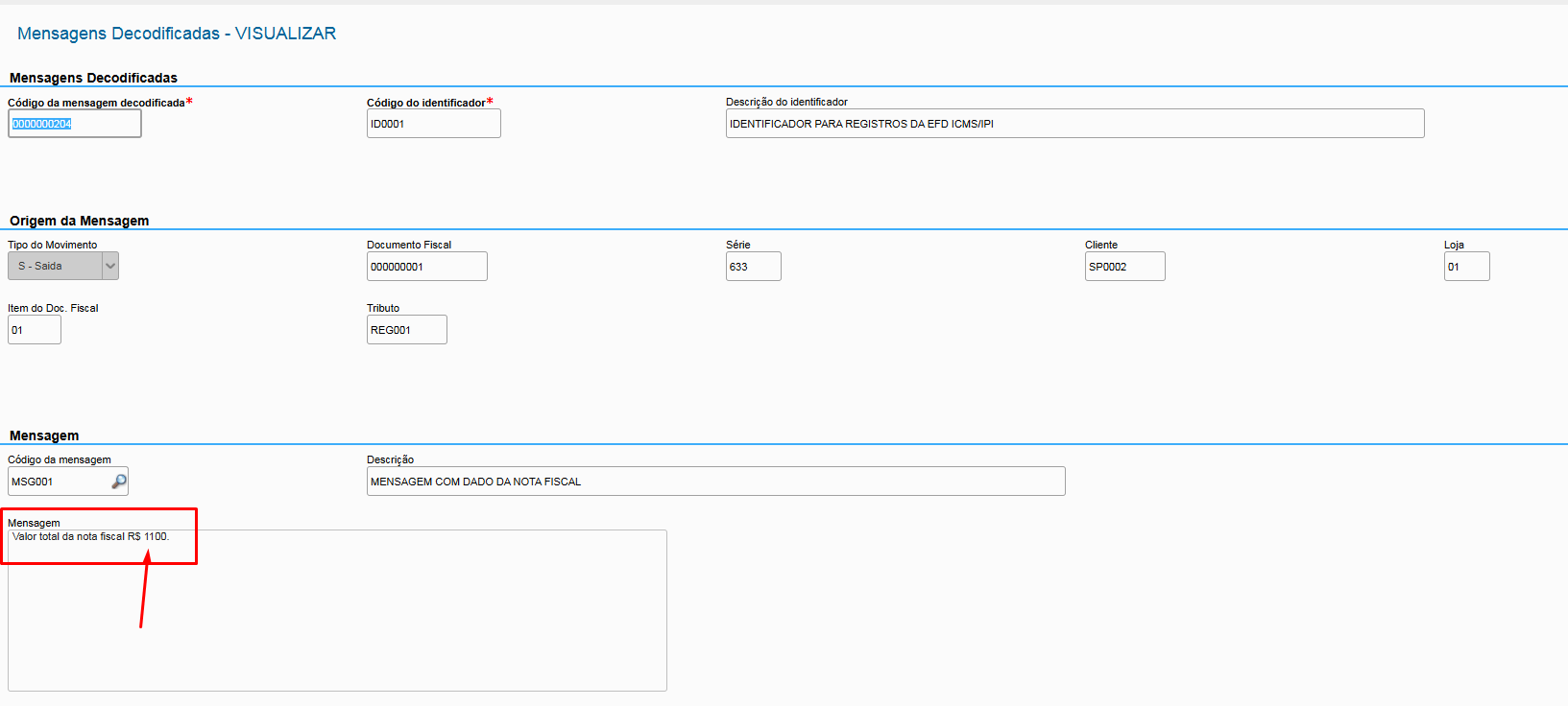 Os dados relevantes à mensagem são demonstrados como o identificador utilizado e dados da nota fiscal assim como do item ao qual a mensagem está atrelada.