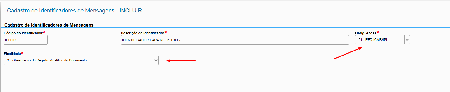 Basicamente, os campos Obrig.Acess e Finalidade definem para onde a mensagem atrelada a ele será levada. Por exemplo, se eu quiser que uma mensagem seja levada nos registros C190, D190, D790 da EFD ICMS/IPI eu devo usar as seguintes opções: