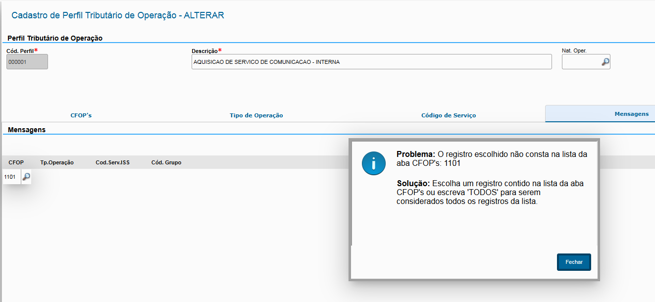 Conforme a descrição dos campos acima, não é possível escolher um CFOP, Tipo de Operação e Código de Serviço que não conste nas abas do cadastro do Perfil de Operação. Caso seja escolhido algum dado inexistente nessas abas o Sistema irá acusar o erro: