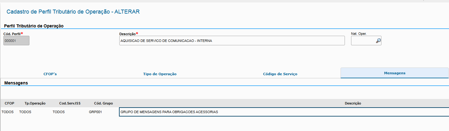 Já no perfil de operação a forma de amarrar um grupo de mensagens é um pouco diferente. Como no perfil de operações temos CFOPs, Tipos de Operação e Códigos de Serviço é possível amarrar um grupo de mensagens baseado nessas três abas do perfil de operação.