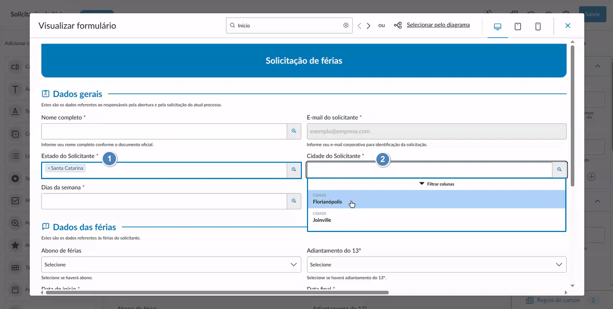 También es posible iniciar el campo con filtros preconfigurados, haciendo el formulario más eficiente e intuitivo para quienes lo respondan. Todas estas posibilidades son configurables sin la necesidad de codificación adicional. ¡Actualice su plataforma y aproveche esta evolución!