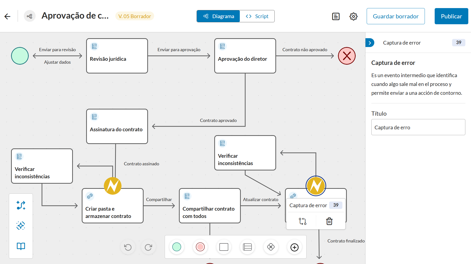 Este evento permite el tratamiento estructurado de excepciones durante la ejecución del servicio configurado en la actividad. Con este, es posible identificar fallas en la activación de servicios externos y definir acciones correctivas o alternativas, aumentando la robustez y la confiabilidad de los flujos automatizados.