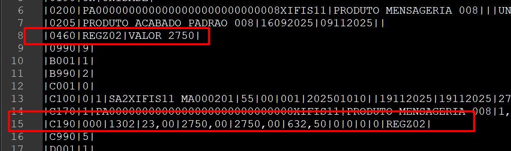 Verifique também que o código da mensagem REGZ02, vinculado ao Cadastro de Grupos de Mensagens, foi gerado com sucesso no registro C190. Além disso, o código e a fórmula configurados foram gerados no registro 0460.