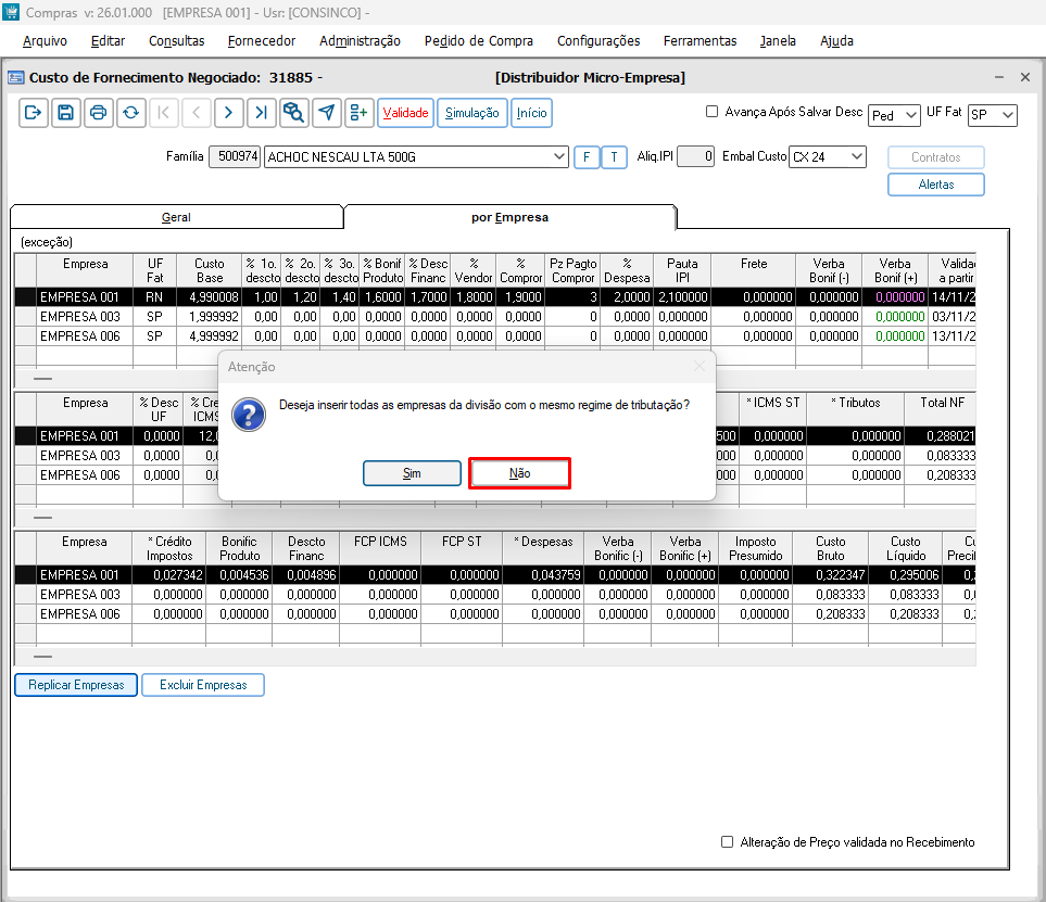 Ao abrir o processo de replicação e a mensagem "Deseja inserir todas as empresas da divisão com o mesmo regime de tributação?" for exibida, o usuário deverá selecionar a opção "não".