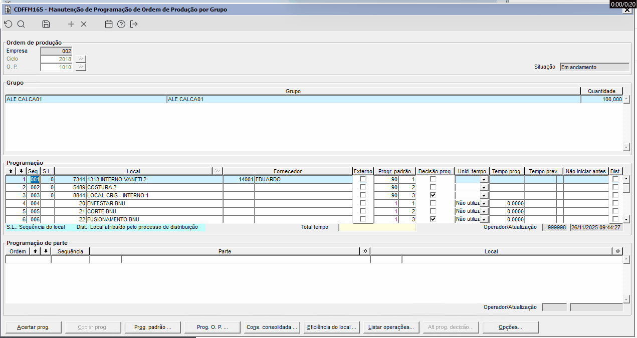 GIF 2 - No GIF acima, é exibido o processo de criação de uma O.P. com o parâmetro TP_PROGRAMACAO_OP definido como 0 e o parâmetro CD_PROGRAMACAO_PADRAO vazio (ADMFM014). No componente CDFFM010, é realizado o vínculo do grupo com a programação e, ao criar a O.P. no componente PCPFM144 e acessar a programação no componente CDFFM165, toda a programação da O.P. é exibida corretamente.