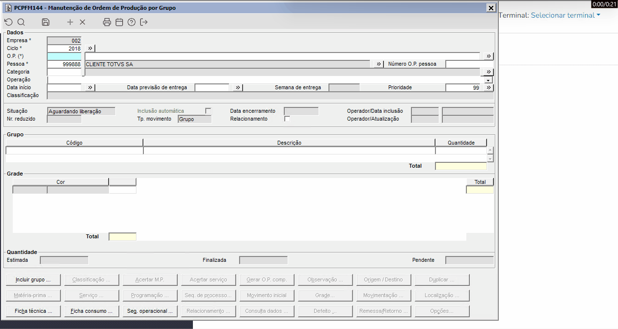 GIF 3 - No GIF acima, é exibido o processo de criação de uma O.P., com o vínculo entre classificação, programação e grupo de produto já realizado. Ao criar a O.P. no componente PCPFM144 e acessar a programação no componente CDFFM165, toda a programação da O.P. é exibida corretamente, carregando toda a cadeia de programações relacionadas a partir da programação inicial.