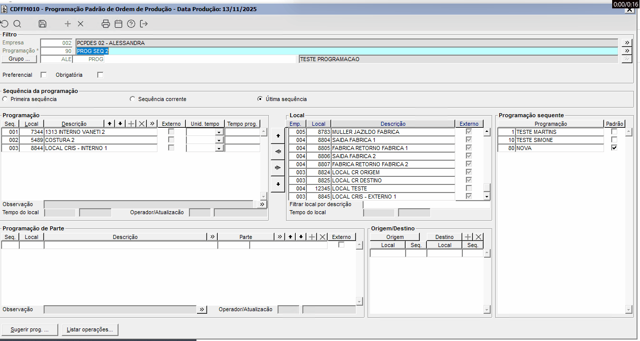 GIF 1 - No GIF acima é exibido o processo de criação de uma O.P. com o parâmetro TP_PROGRAMACAO_OP definido como 1 (ADMFM014). Ao selecionar, no componente CDFFL003, uma programação padrão que possua programação sequente vinculada, essa programação pode ser visualizada ao acionar o botão “Programação”, que abre o componente CDFFM165. Na lista “Programação”, foram adicionadas as novas colunas “Progr. padrão” e “Decisão prog.”, que indicam a programação o local pertence e, quando o local é o último de sua programação, o checkbox “Decisão prog.” é apresentado marcado.