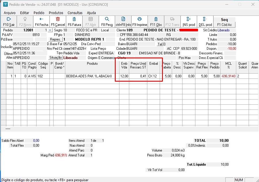 Imagem 2 - Pedido correto sendo carregado na aplicação de pedido de venda
