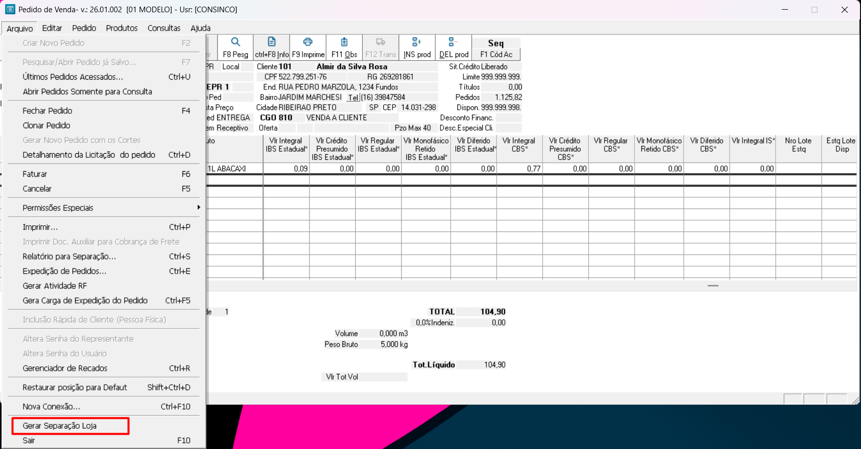 Imagem 1 - Pedido de Vendas - Opção Gerar Separação Loja