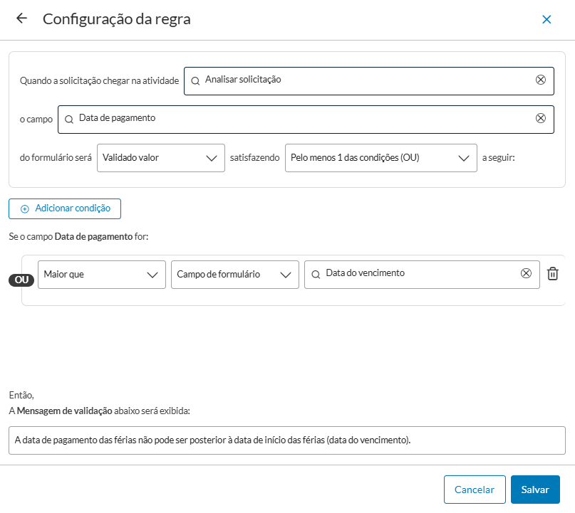 En el proceso de pago de vacaciones, la regla garantiza que la Fecha de Pago de las vacaciones no sea registrada después de la Fecha de Inicio de las vacaciones (fecha de vencimiento), evitando inconsistencias en el cronograma de pago al colaborador.