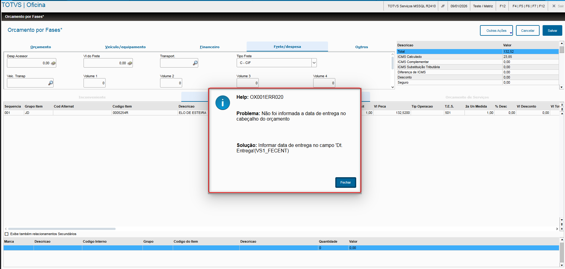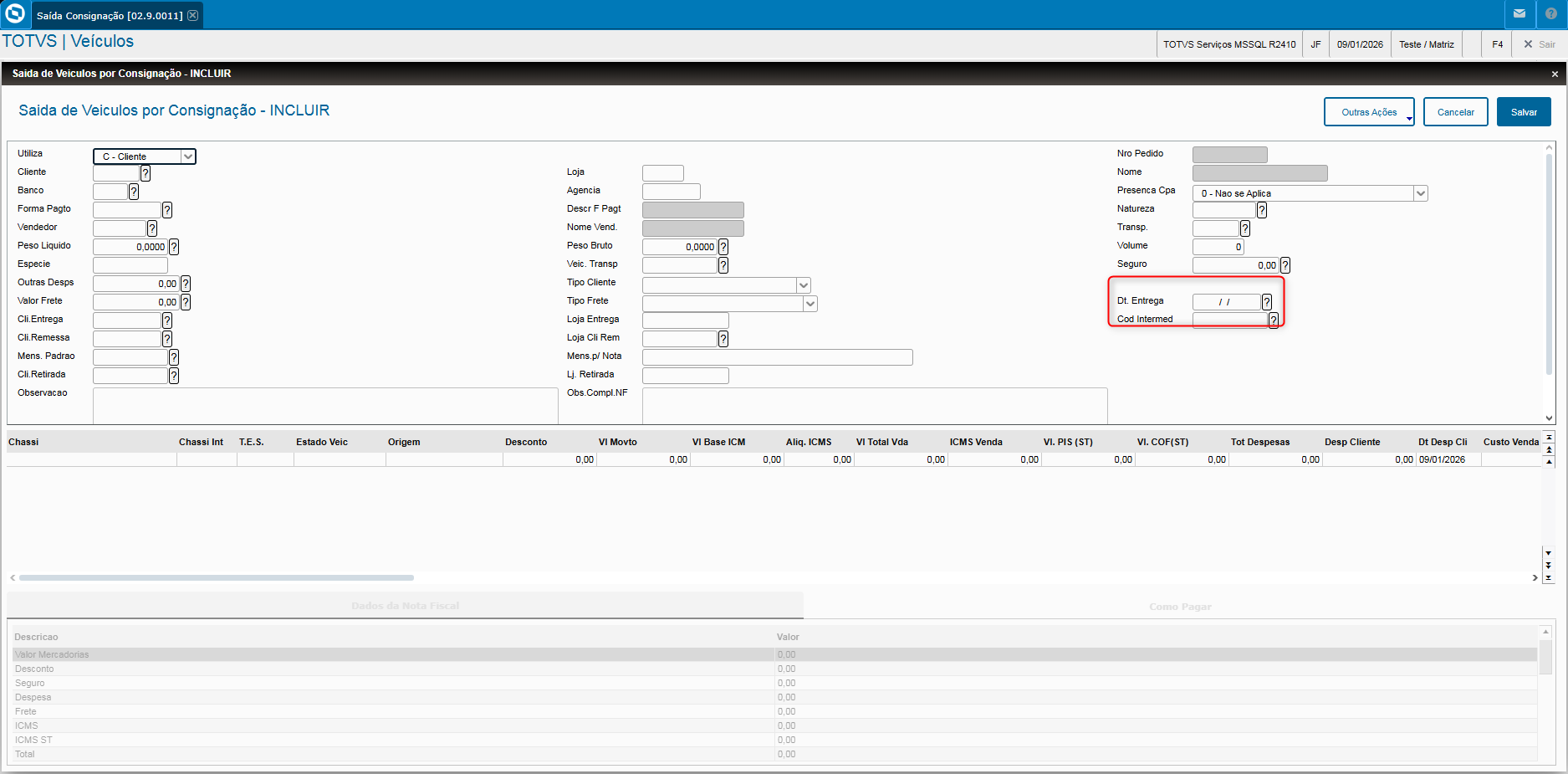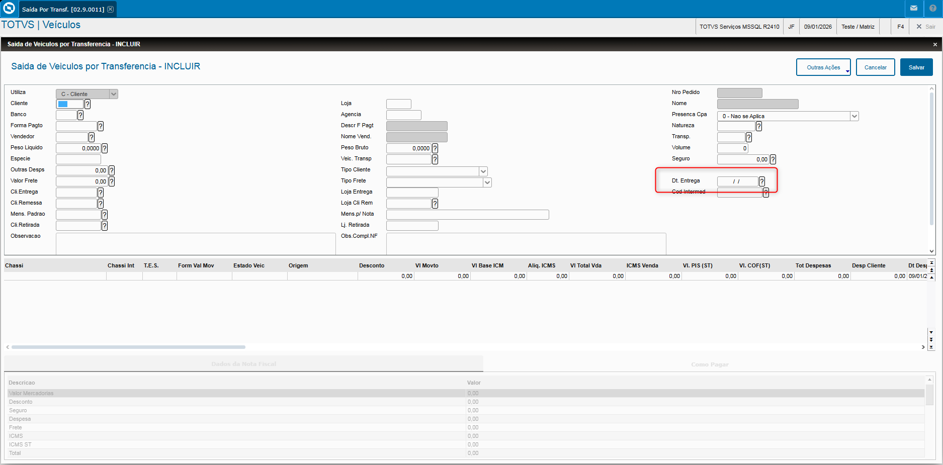 - Veja também que, quando os campos referentes ao tipo de frete estiverem preenchidos com C – CIF, T – Por conta de Terceiros ou R – Por conta do Remetente, o campo “Dt. Entrega” (VV0_FECENT) passa a ser obrigatório.