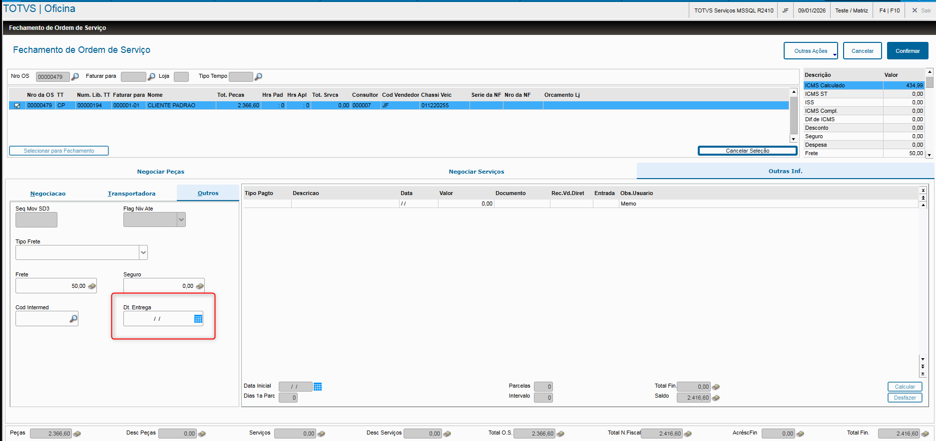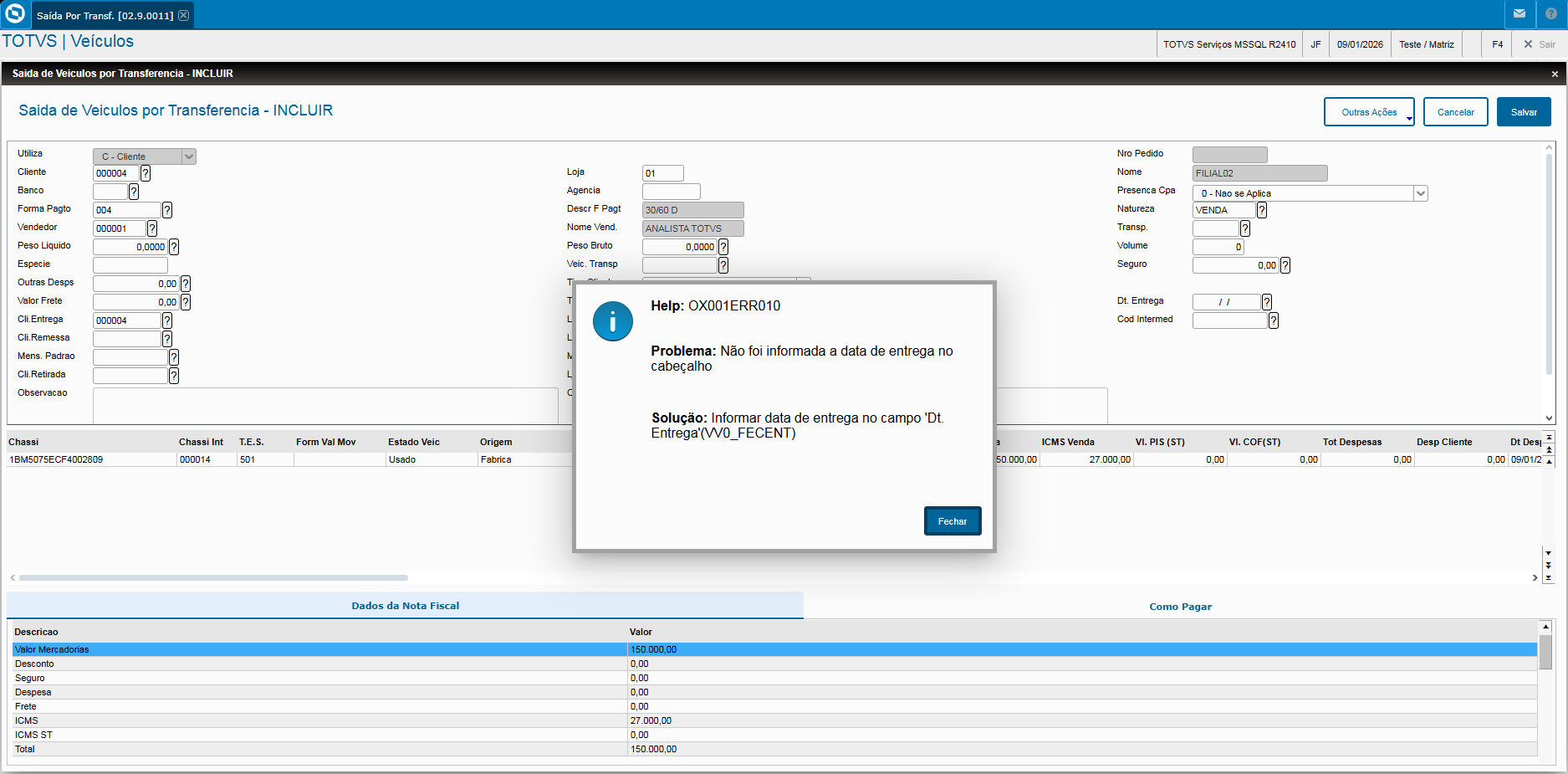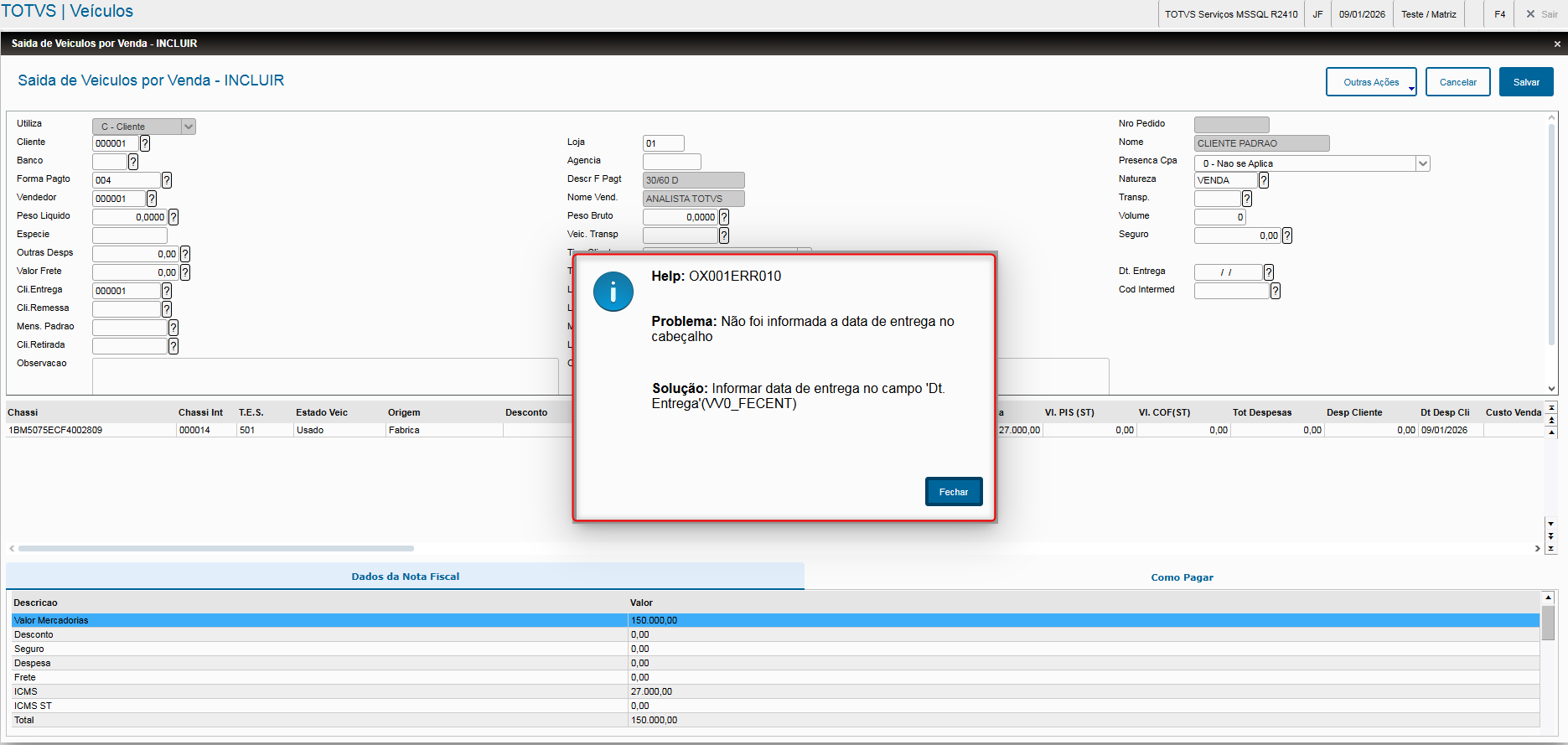 - Veja também que, quando os campos referentes ao tipo de frete estiverem preenchidos com C – CIF, T – Por conta de Terceiros ou R – Por conta do Remetente, o campo “Dt. Entrega” (VV0_FECENT) passa a ser obrigatório.