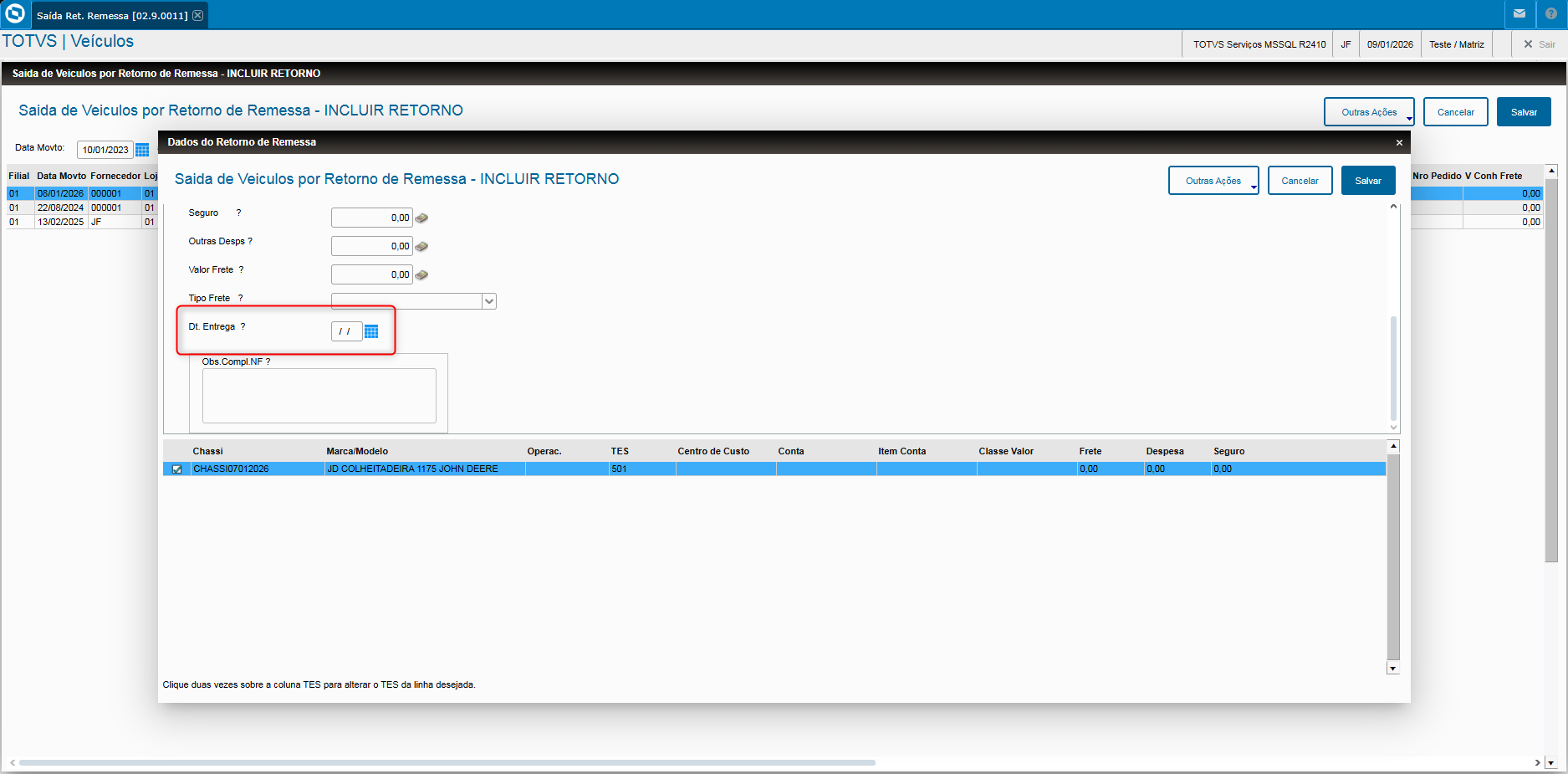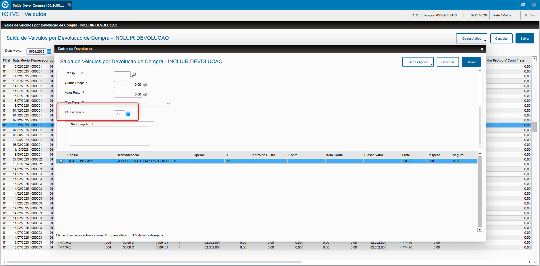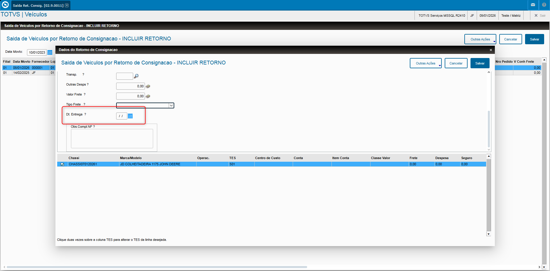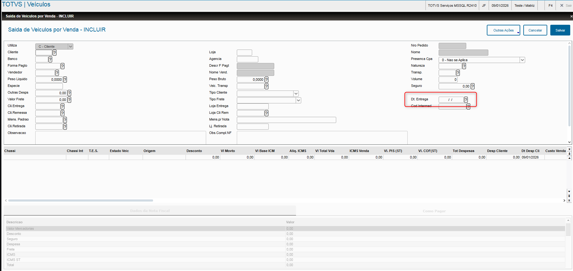 - Veja que consta em tela o campo Dt. Entrega (VV0_FECENT);