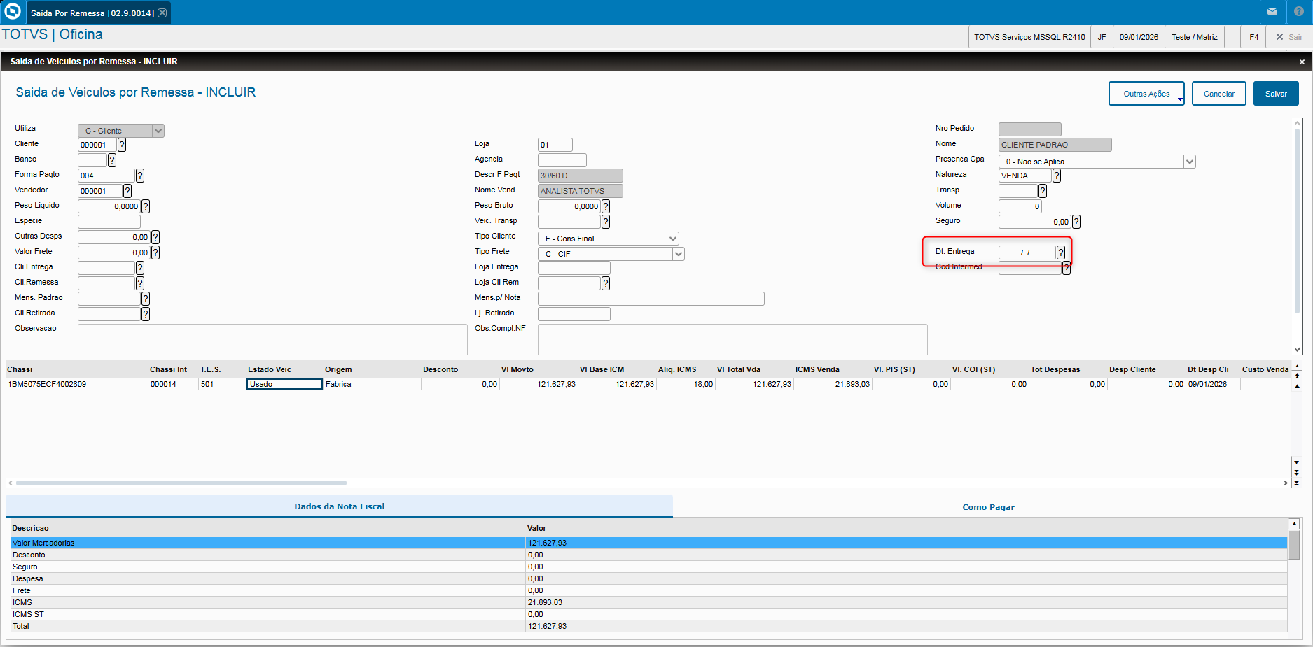 - Veja também que, quando os campos referentes ao tipo de frete estiverem preenchidos com C – CIF, T – Por conta de Terceiros ou R – Por conta do Remetente, o campo “Dt. Entrega” (VS1_FECENT) passa a ser obrigatório.