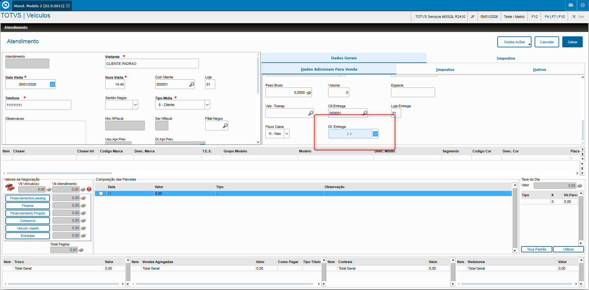 - Veja que na aba de dados adicionais da venda consta o campo Dt. Entrega (VV0_FECENT);
