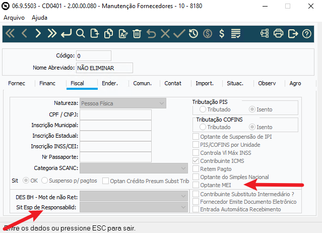 Agora, quando o usuário informar a Situação Especial de Responsabilidade no cadastro do fornecedor, esse valor será utilizado diretamente na geração do arquivo. Caso nenhuma informação seja preenchida, o sistema continuará seguindo a regra atual, sem alterações no comportamento.
