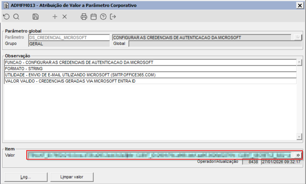 Imagem 1 – Demonstra, a implementação do novo parametro DS_CREDENCIAL_MICROSOFT no componente ADMFM013.