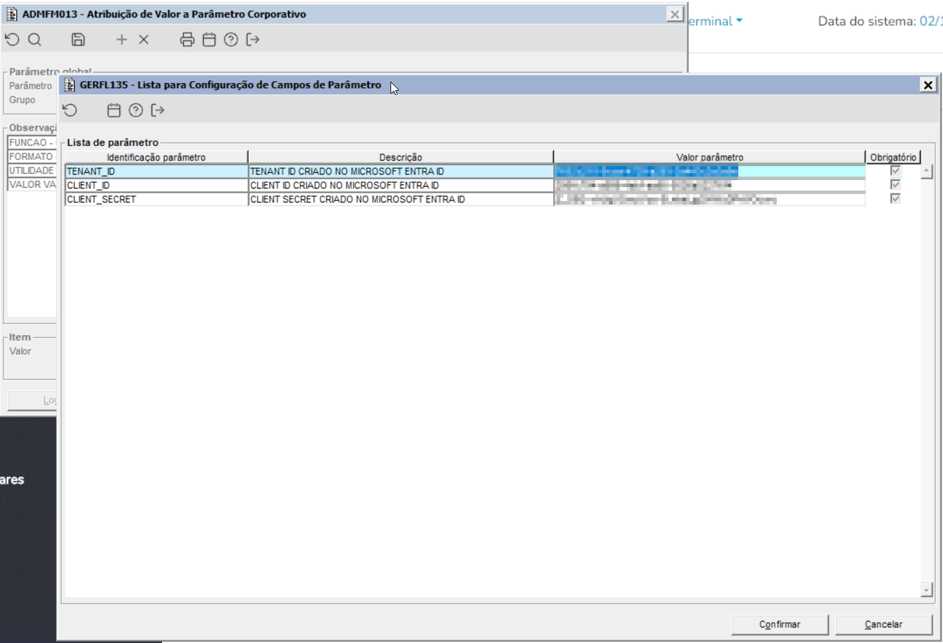 Imagem 2 – Demonstra o componente GERFL135, utilizado para configuração dos subparâmetros de autenticação relacionados ao Microsoft Entra ID (DS_CREDENCIAL_MICROSOFT), acionado pelo componente ADMFM013.