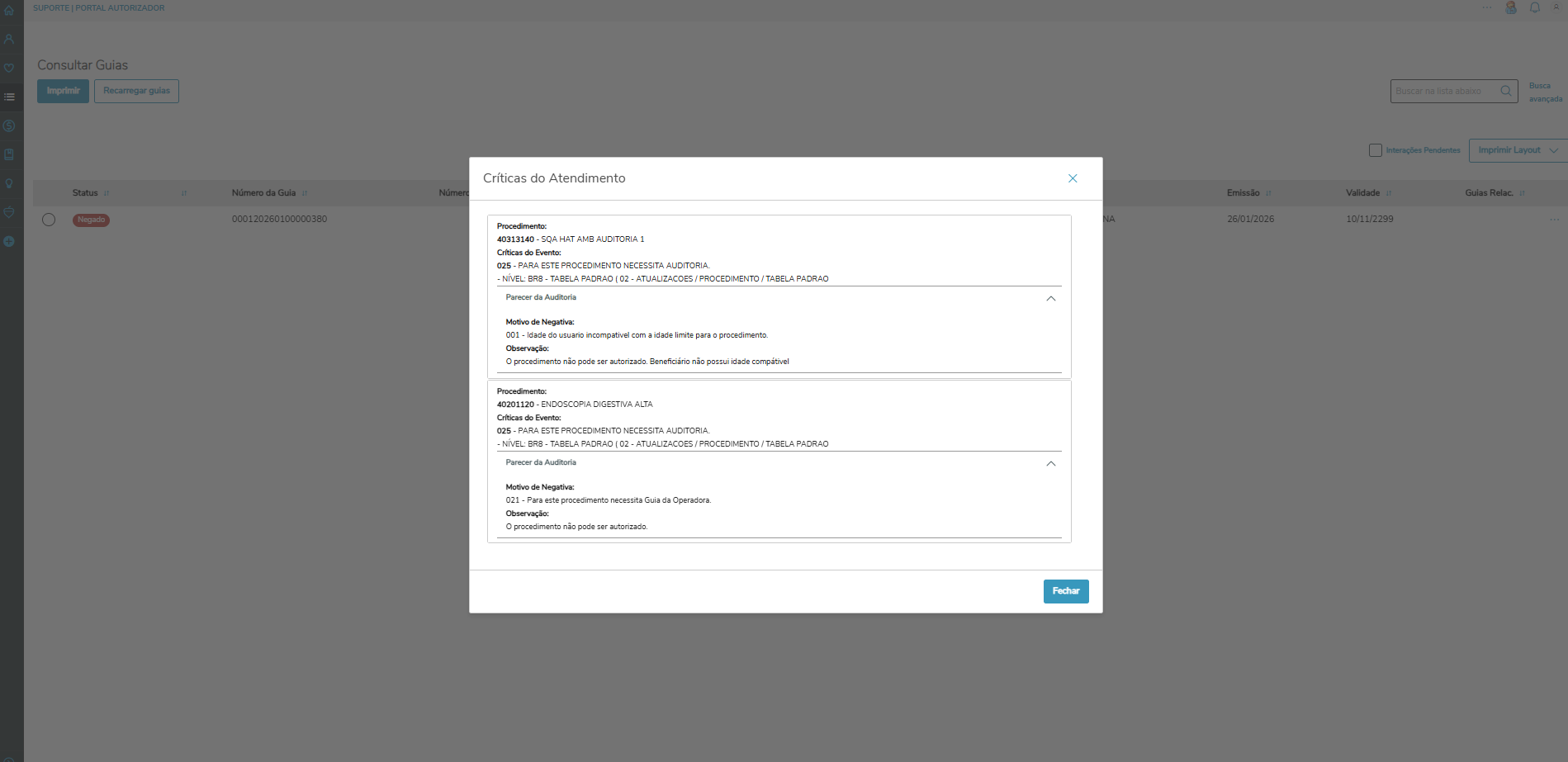 Ao selecionar a opção Ver Críticas de uma guia que foi negada pela auditoria, serão exibidos os dados referentes ao motivo da negativa: código e descrição.