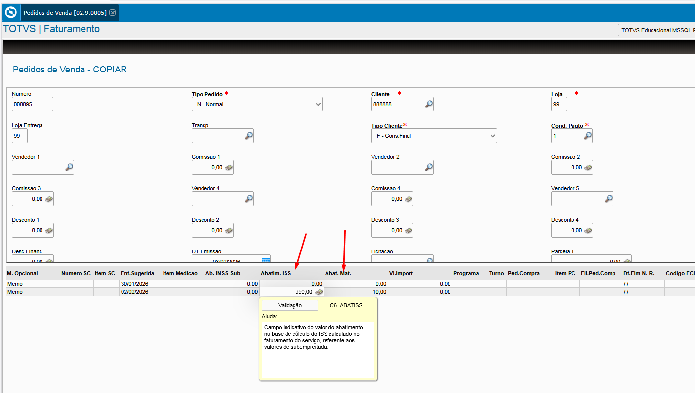 - Na nfse nacional para destacar a dedução da base do ISS primeiro colocar o parâmetro MV_NFSEDED = .T. no pedido o valor da dedução á alimentado pelo campo C6_ABATISS (Abatim.ISS)