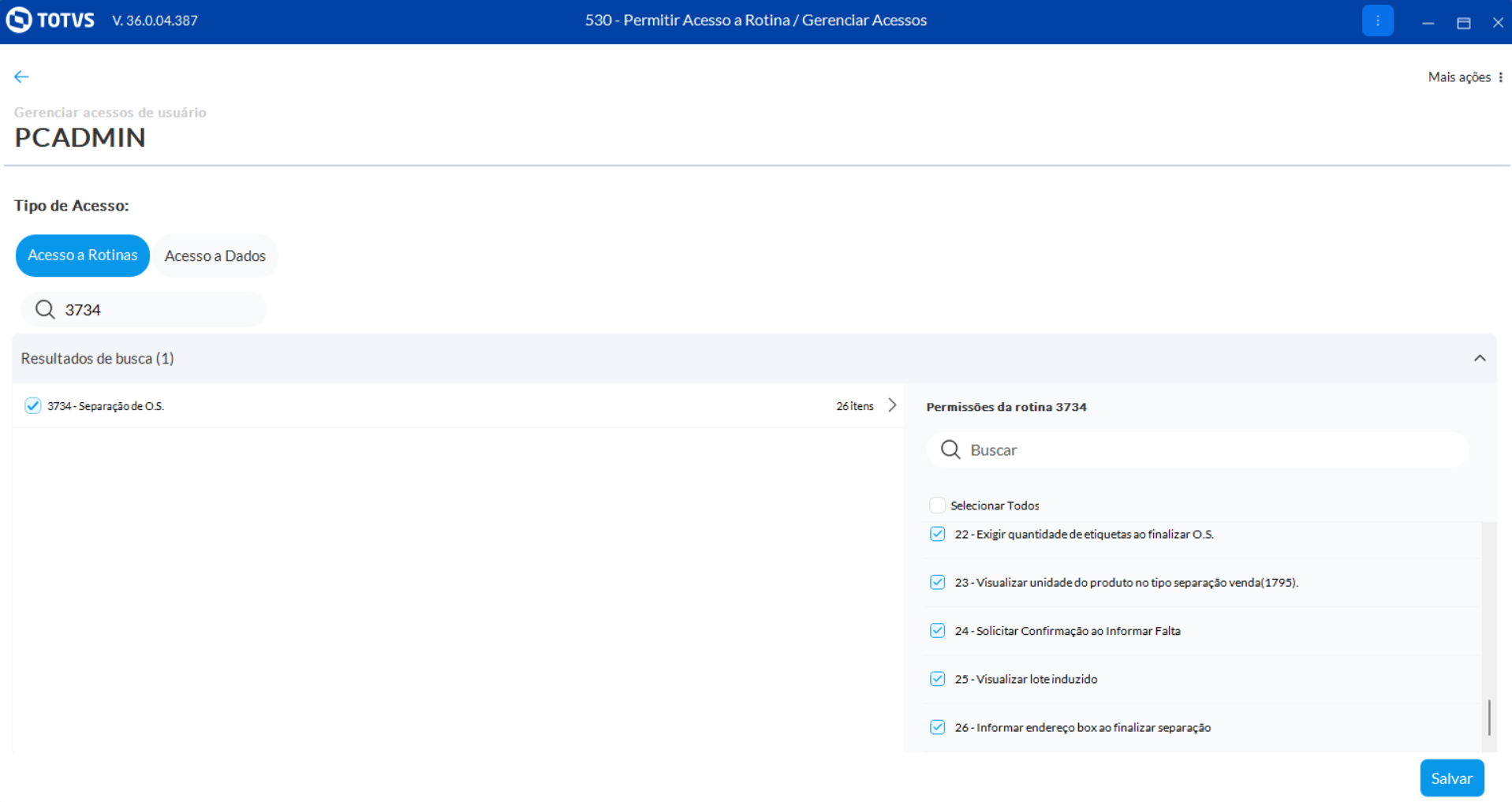Acesse a Rotina 530 – Permitir Acesso a Rotina / Gerenciar Acessos.