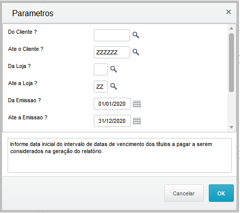 El sistema mostrará la ventana con los parámetros referentes al informe.