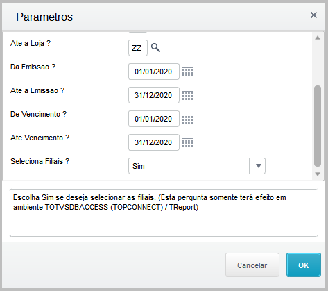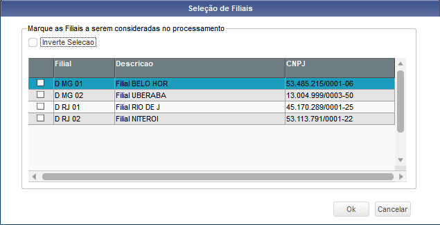 Si el parámetro "Selecciona Sucursales" estuviera como "Sí", aparecerá una pantalla que definirá las informaciones de las sucursales que el informe presentará.