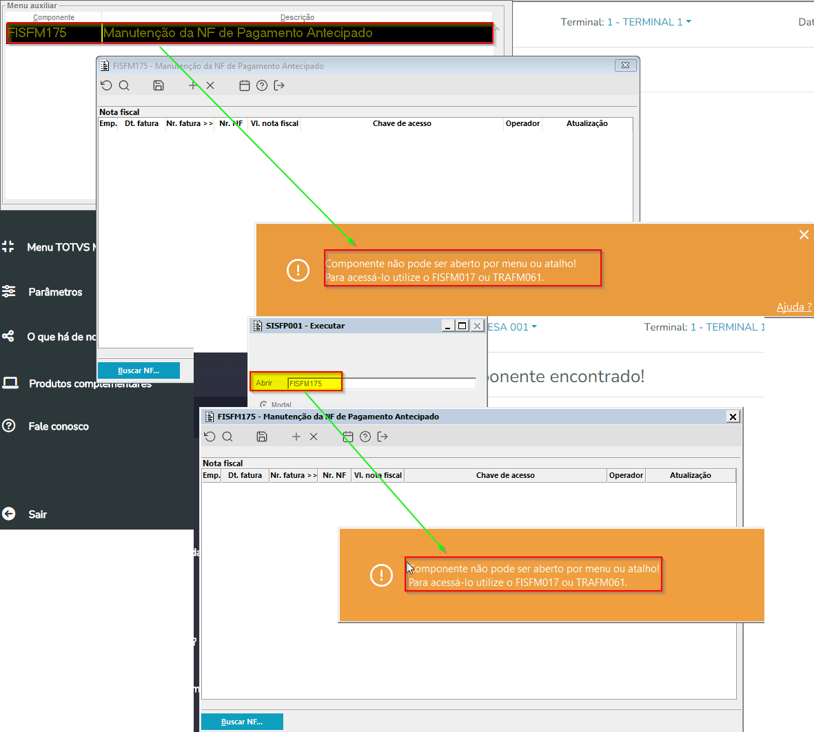 Imagem 01 - Demonstração no FISFM175 de Manutenção da NF de Pagamento Antecipado, evidenciando que o componente não pode ser aberto pelo atalho "Componentes" ou pelo atalho "Executar".