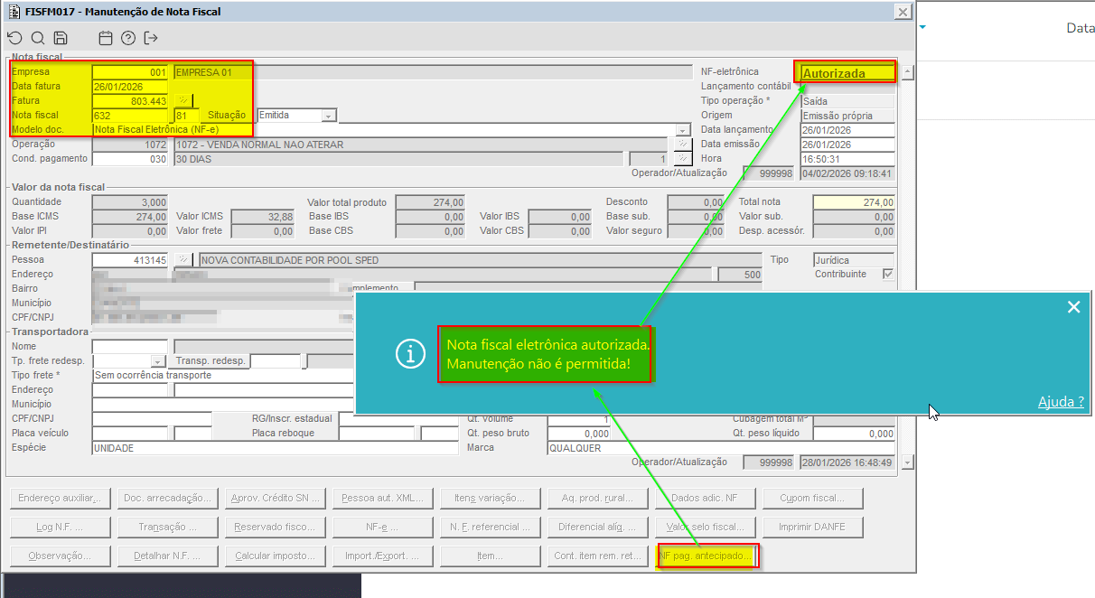 Imagem 02 - Demonstração no FISFM017 de Manutenção de Nota Fiscal, evidenciando a chamada do botão "NF pag. antecipado" com o retorno da mensagem "Nota fiscal eletrônica autorizada. Manutenção não é permitida!".
