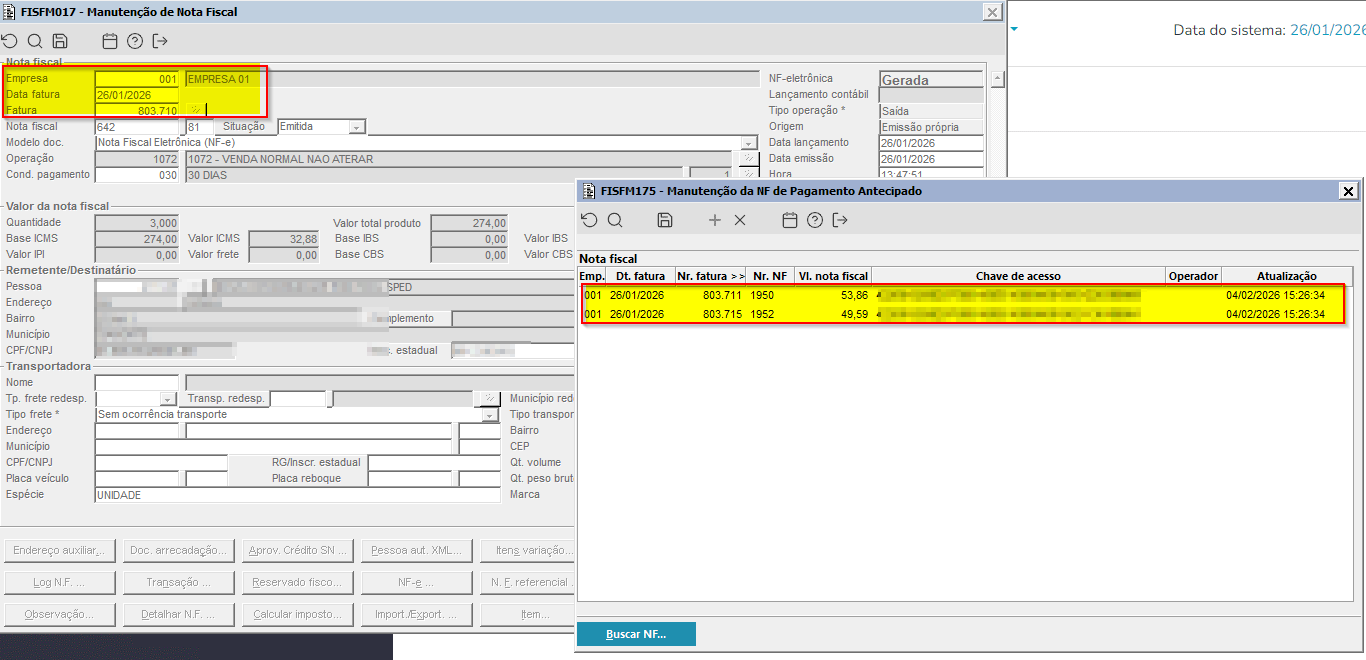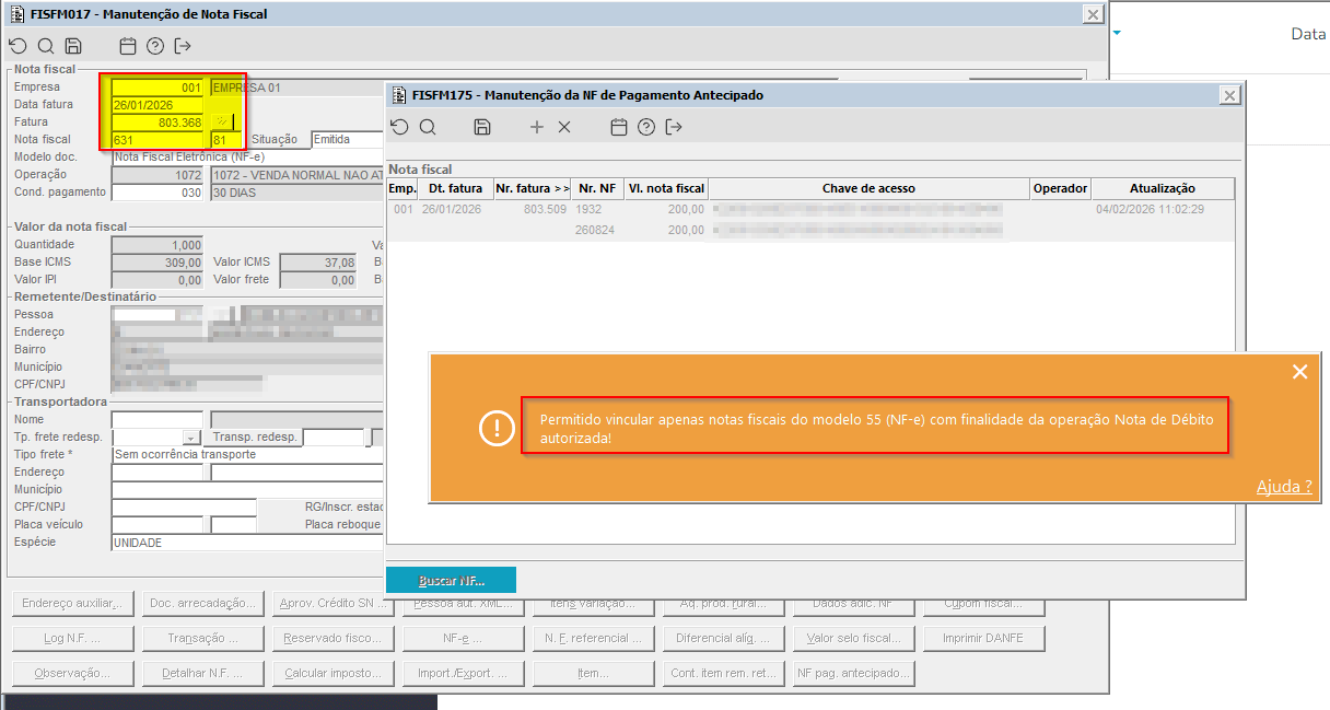 Imagem 04 - Demonstração no FISFM175 de Manutenção da NF de Pagamento Antecipado, evidenciado 2 NF de debito autorizadas.