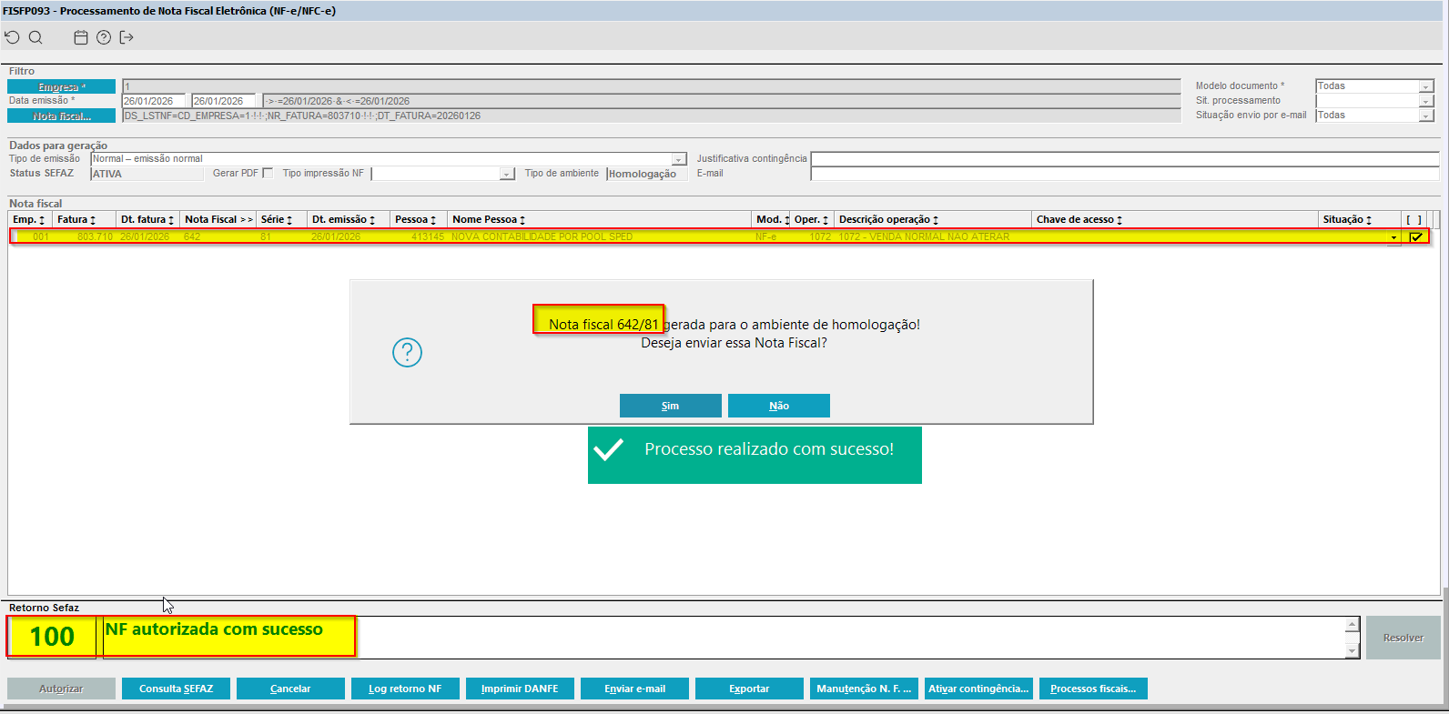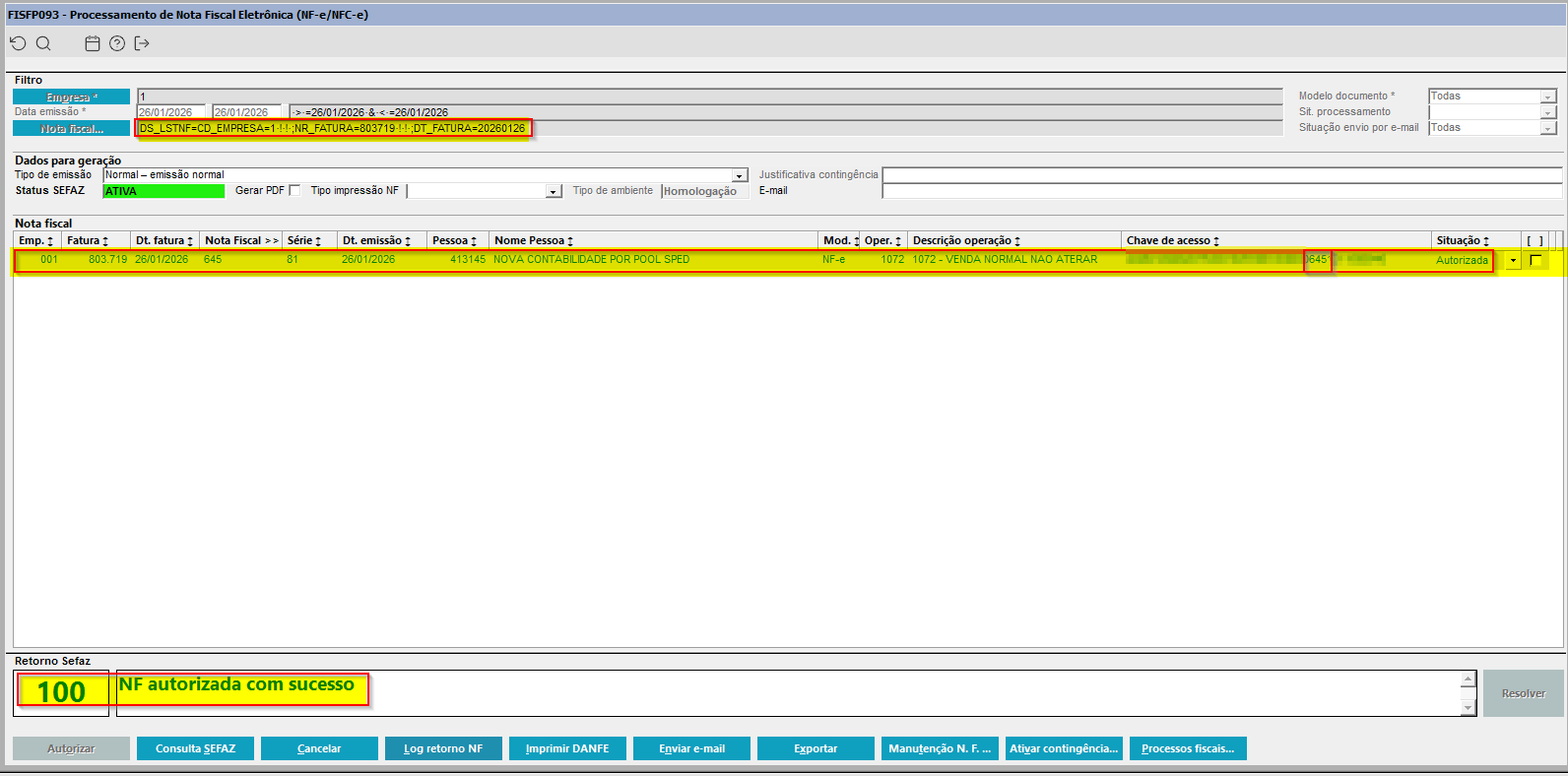 Imagem 05 - Demonstração no FISFP093 de processamento de Nota Fiscal Eletrônica(NF-e/NFC-e), evidenciando o retorno da SEFAZ como "NF autorizada com sucesso".
