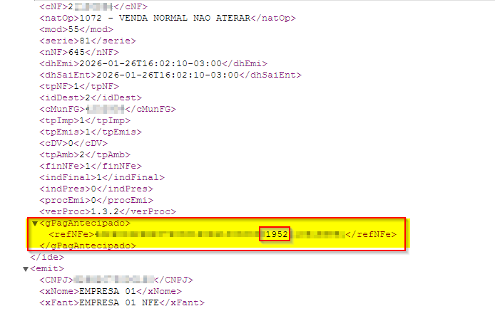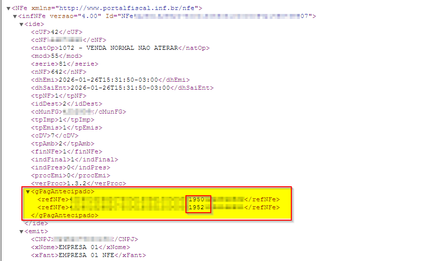 Imagem 06 - Demonstração do XML pelo FISFP093, evidenciando a tag gPagAntecipado com as chaves das 2NF referenciadas.